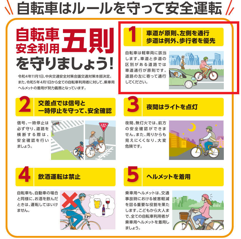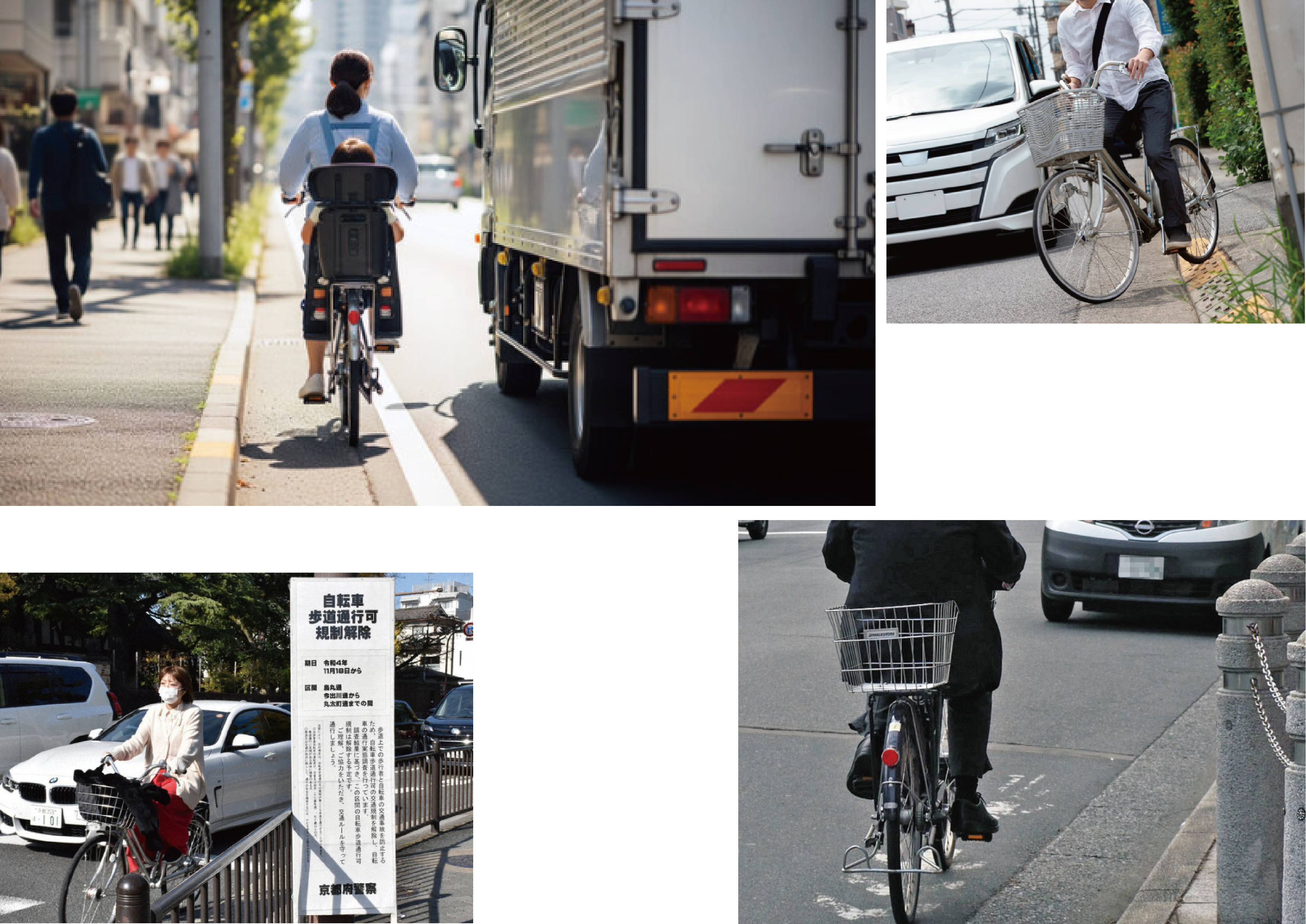 特に自転車で歩道を走行すると、違反対象(反則金6,000円)になることがあります。